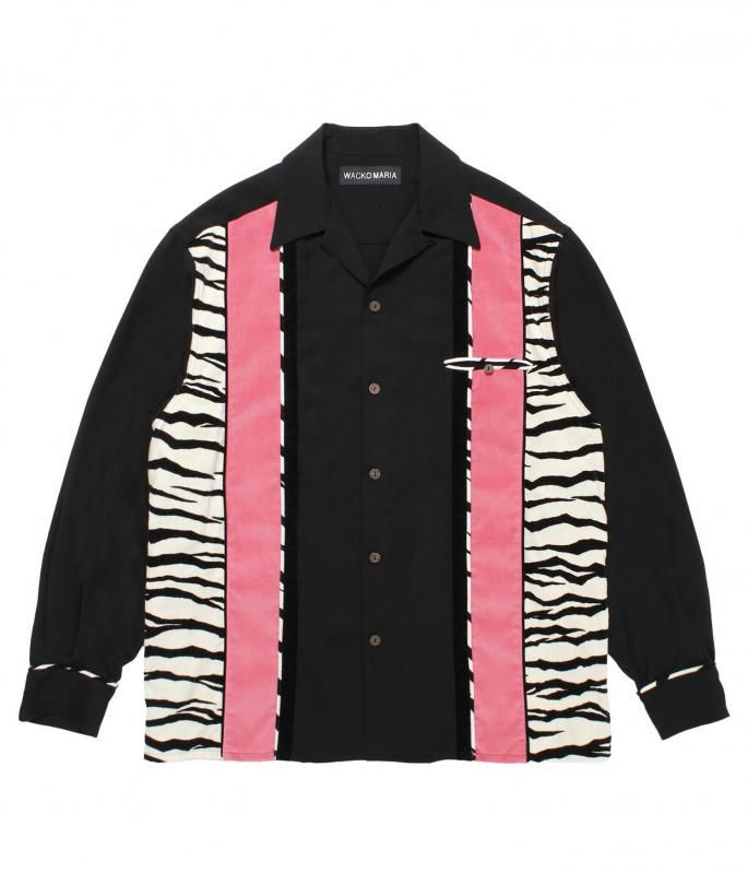 レオパード柄のベロア生地の切り替え、各所にパイピング切り替えを施したオープンカラーシャツ。